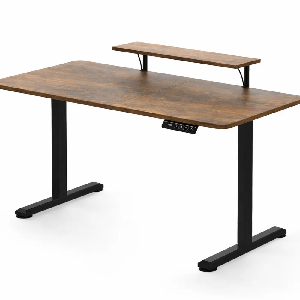 Bureau réglable en hauteur motorisé, plateau noir et structure métallique, design ergonomique et moderne.