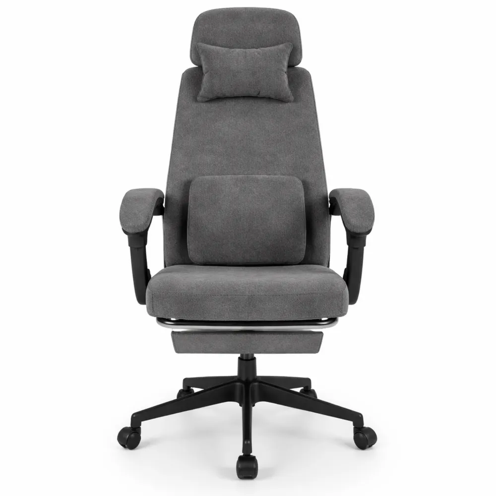 Profitez du repose-pieds intégré pour ajouter un supplément de confort durant vos pauses. Il contribue à soulager les jambes et à améliorer la circulation. Le dossier ergonomique dispose d'un appuie-tête et d'un coussin lombaire pour offrir un soutien adapté. Cette conception suit les courbes naturelles du corps pour réduire les tensions lors des longues sessions assis. La mousse à haute résilience associée au tissu de chenille apporte une sensation douce et moelleuse, propice au bien-être même après de nombreuses heures d'utilisation. Ajustez la hauteur d'assise et l'inclinaison du dossier pour maintenir différentes postures selon vos besoins, que vous soyez en train de travailler, lire ou vous détendre. Les roulettes et la base pivotante à 360 facilitent la mobilité. Sa structure métallique renforcée et le vérin pneumatique assurent une bonne stabilité et une capacité de charge importante.
